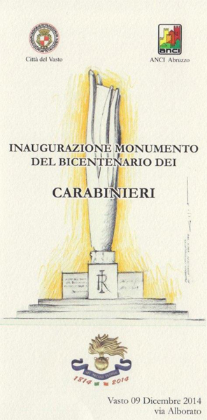 Per onorare l’Arma dei Carabinieri in occasione del Bicentenario della sua Fondazione (1814-2014) e nell’ambito del progetto di riqualificazione di una nuova zona di urbanizzazione della città di Vasto, il Sindaco Luciano Lapenna inaugurerà il Monumento il 9 dicembre alle 10:00 a Vasto. E’ un’opera dello scultore Giuseppe Colangelo che ha la vocazione di scolpire un'idea partorita da un’osservazione o da una parola o da un avvenimento come quello che lo vedrà, insieme alle Autorità, scoprire il Monumento dedicato ai servitori dello Stato sempre in campo per garantire la sicurezza alla comunità. La cerimonia vedrà anche l’intitolazione di alcune strade del quartiere a sei valorosi Eroi dei Carabinieri che si sono immolati per la Patria.