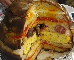 Tagliate la pagnotta orizzontalmente in 4 dischi di eguale spessore e farcitela a strati: disponete sul primo, partendo dalla base, la frittata, sul secondo la salsiccia a rondelle con il suo condimento, sul terzo i peperoni e la pancetta. Ricomponete la pagnotta ed avvolgetela con un telo pulito. Il giorno seguente, tagliatela a spicchi e gustatela.
